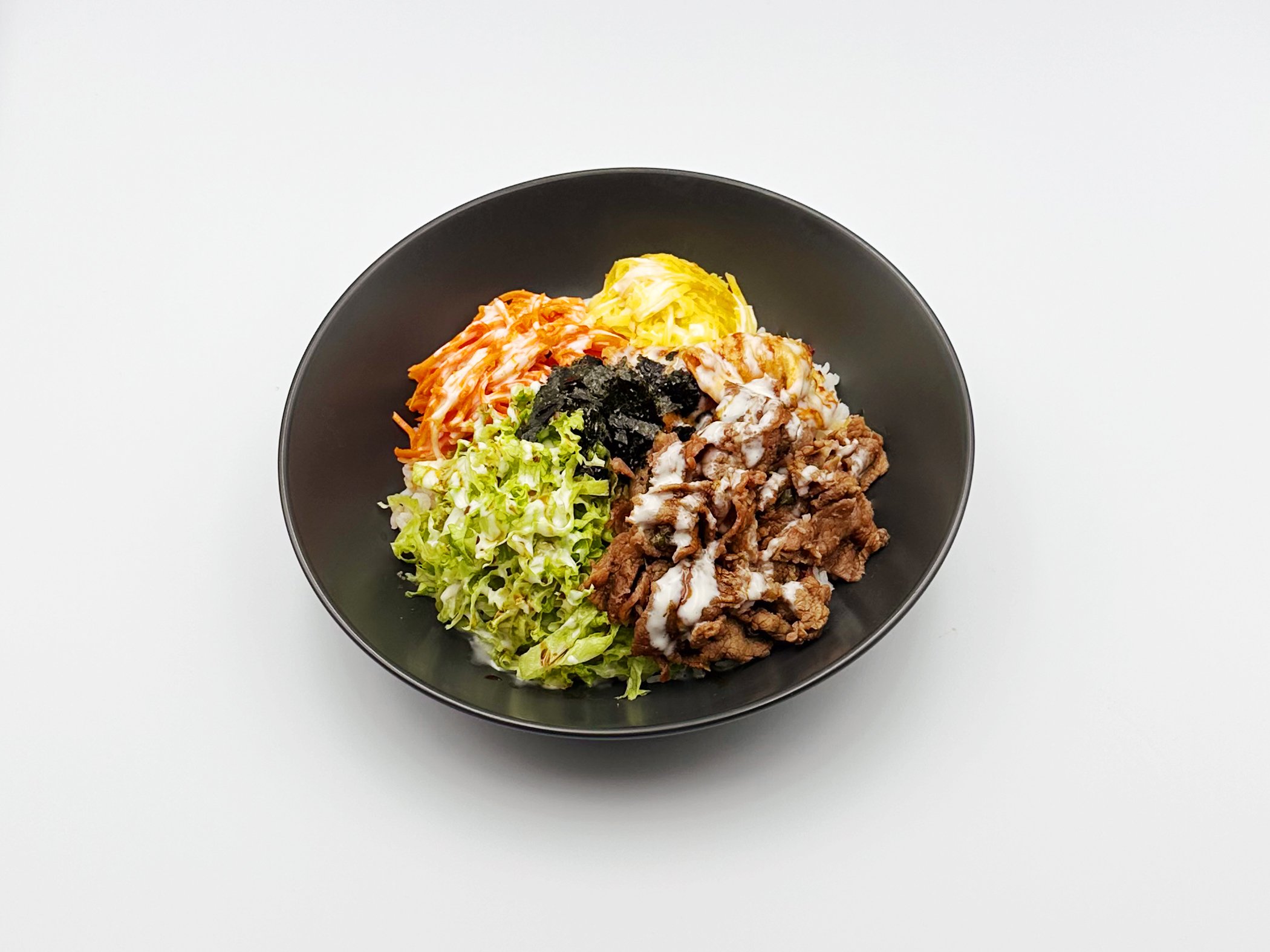 Tender Pork, Mini chicken Mandu, Crispy Seaweeds and Fresh Vegetables on Steamed rice with Zigle’s house white sauce and Sweet soy sauce.