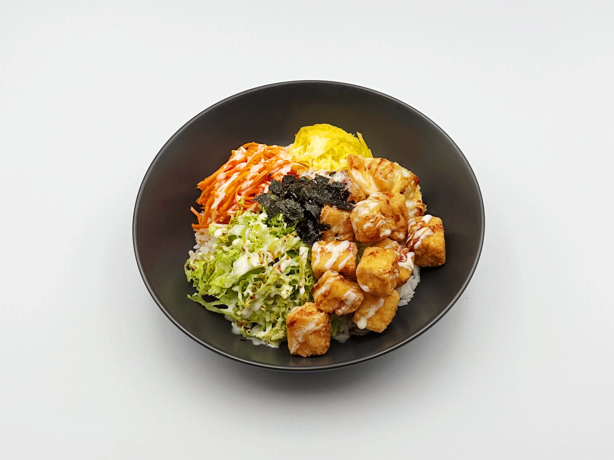 Fried Tofu, Mini chicken Mandu, Crispy Seaweeds and Fresh Vegetables on Steamed rice with Zigle’s house white sauce and Sweet soy sauce.