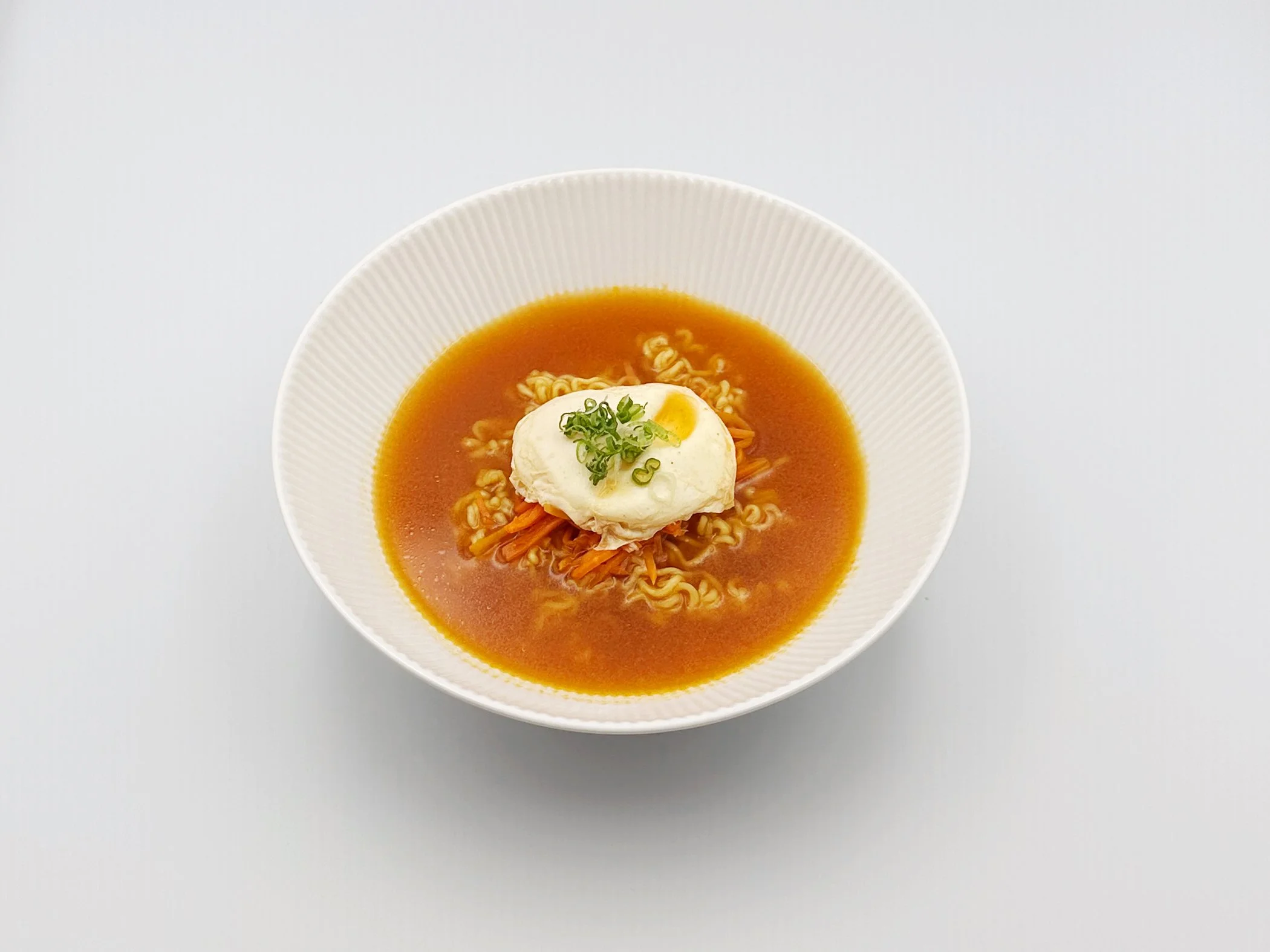 Chewy, springy noodles in a rich beef bone broth with a deep yet mild flavor. Dried green onion, shiitake, and carrot add a subtle texture, while a silky poached egg melts into the broth for a smooth, flavorful finish.