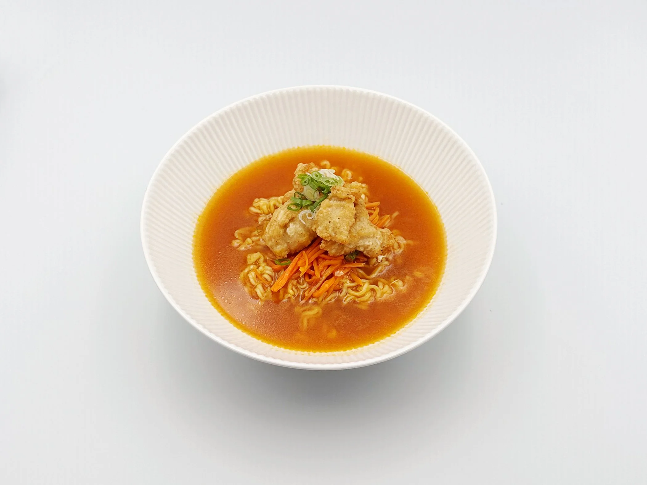 Chewy, springy noodles in a rich beef bone broth with a deep yet mild flavor. Dried green onion, shiitake, and carrot add a subtle texture, while crispy fried chicken soaks up the broth just enough to keep its crunch, creating a perfect balance of texture and flavor.